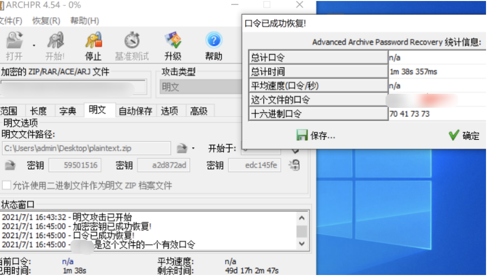 当然我们不需要做这么多麻烦的工作,在 ARCHPR 中有明文攻击这个功能,我们只需要填入两个压缩文件即可。