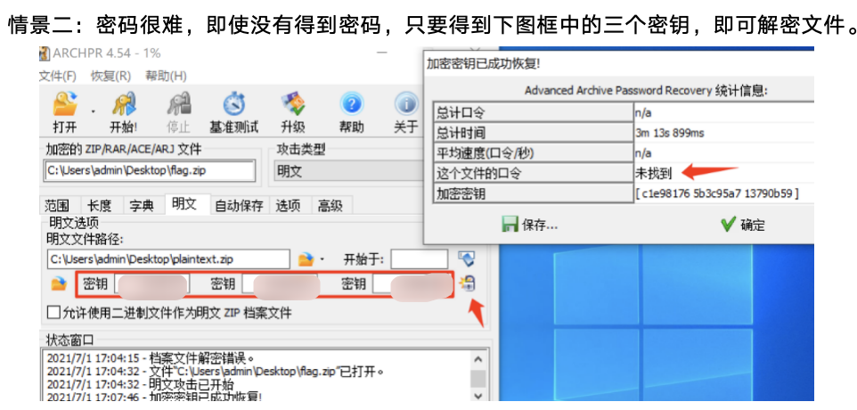 明文攻击是一种较为高效的攻击手段,我们不知道一个压缩包的密码,但是有此压缩包中的一个已知文件(文件需大于12Byte)时,因为同一个压缩包里的所有文件都是使用同一个加密密钥来加密的,所以可以用已知文件来找加密密钥,利用密钥来解锁其他加密文件。
