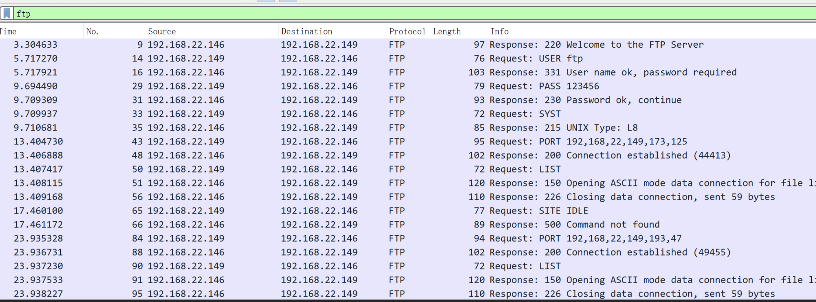 如下图所示,可以看到ftp传输的所有信息,FTP是明文形式传输数据包,我们能在info中看到登录FTP的用户名、密码、执行命令等