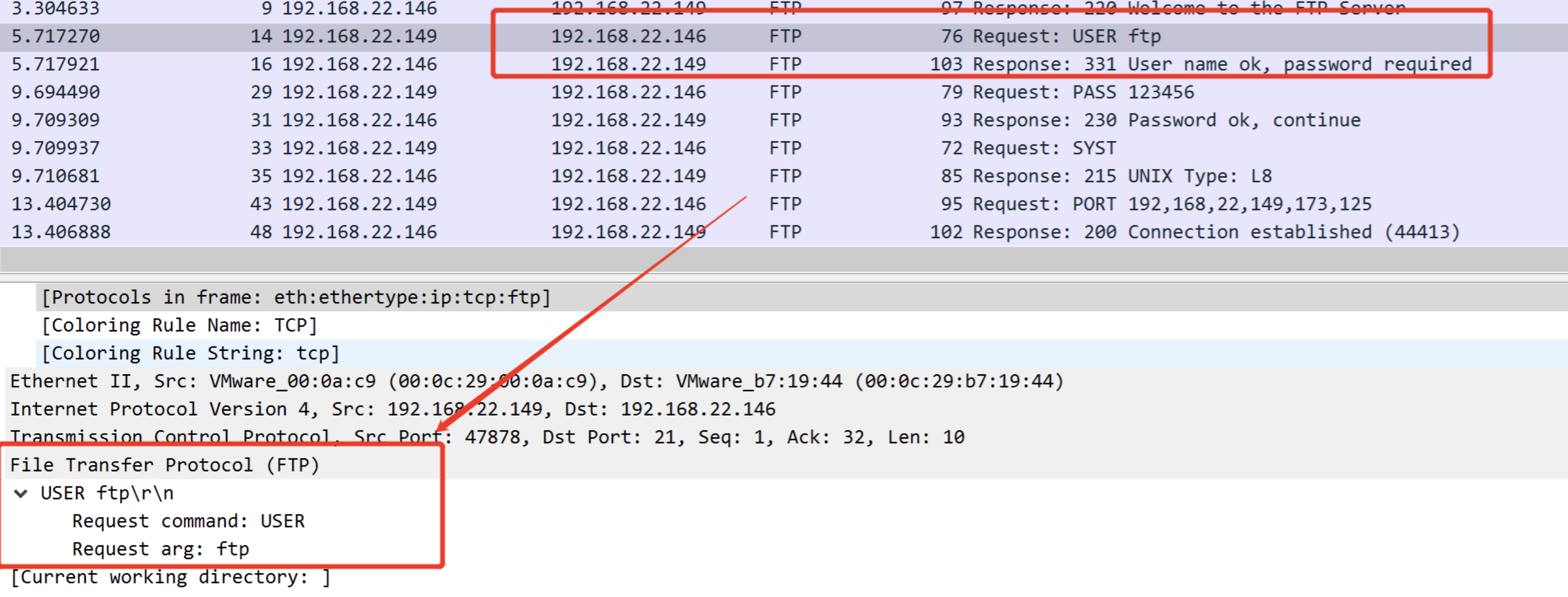 File Transfer Protocol (FTP) USER ftp\r\n Request command: USER Request arg: ftp 使用了FTP协议,输入的用户名为ftp,请求的命令是USER,请求参数为ftp。