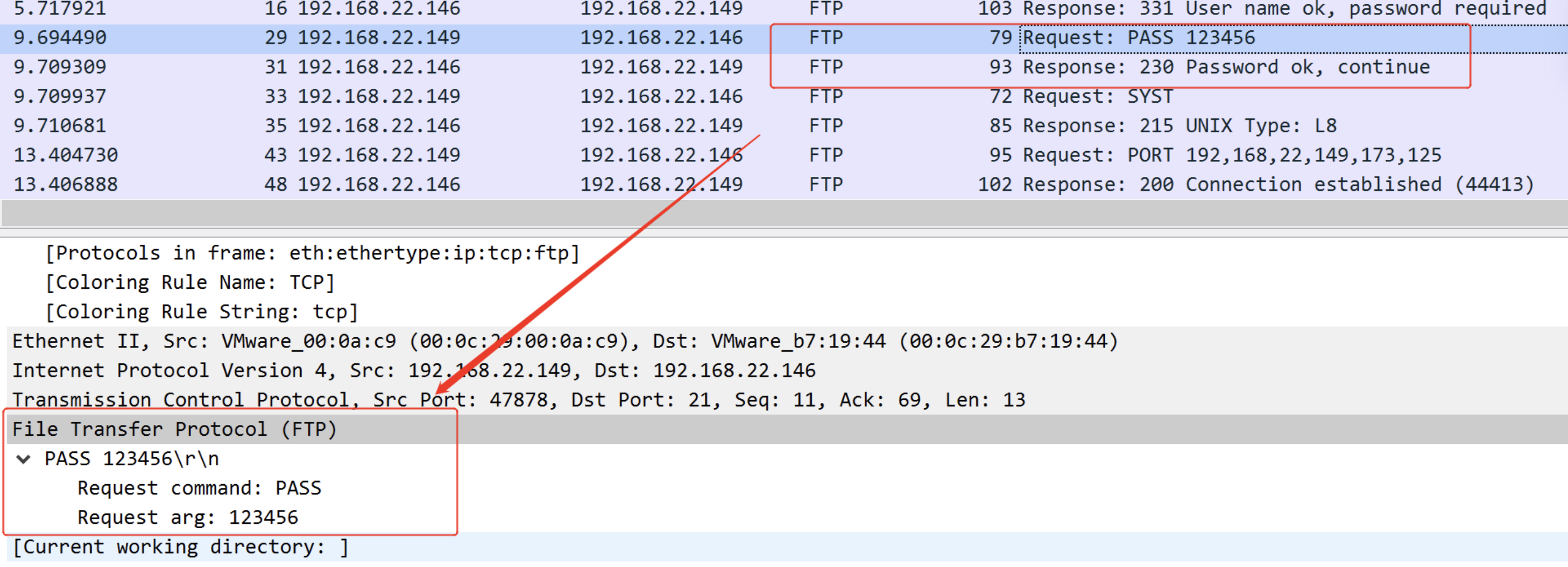File Transfer Protocol (FTP) PASS 123456\r\n Request command: PASS Request arg: 123456 输入的密码为123456,请求的命令是PASS,请求参数为123456。