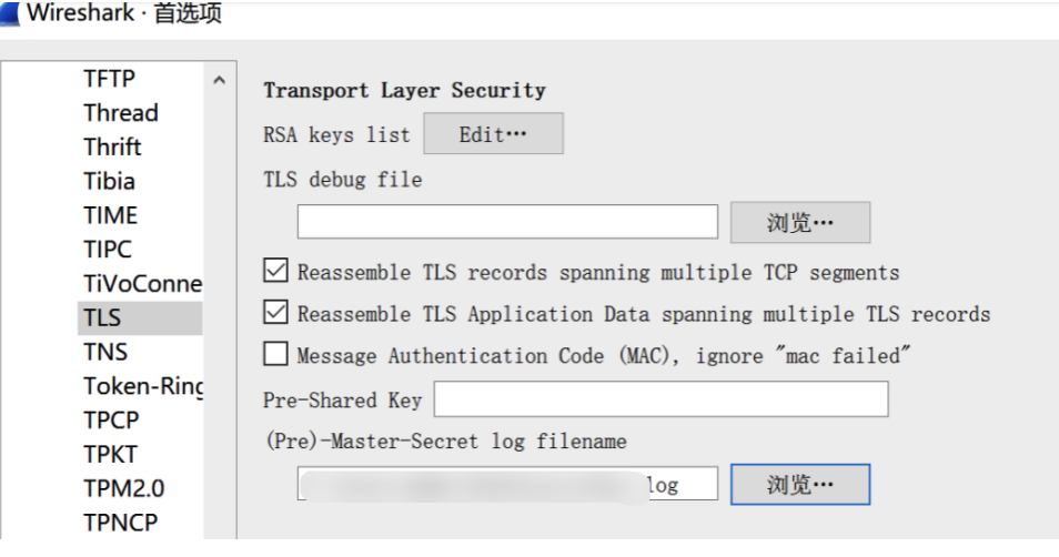 要完成对刚才截获的数据包进行解密,我们只需将该文件导入到 Wireshark 中去,即可对 TLS 流量进行解密。其中导入步骤为 编辑 -> 首选项 -> Protocols -> TLS。