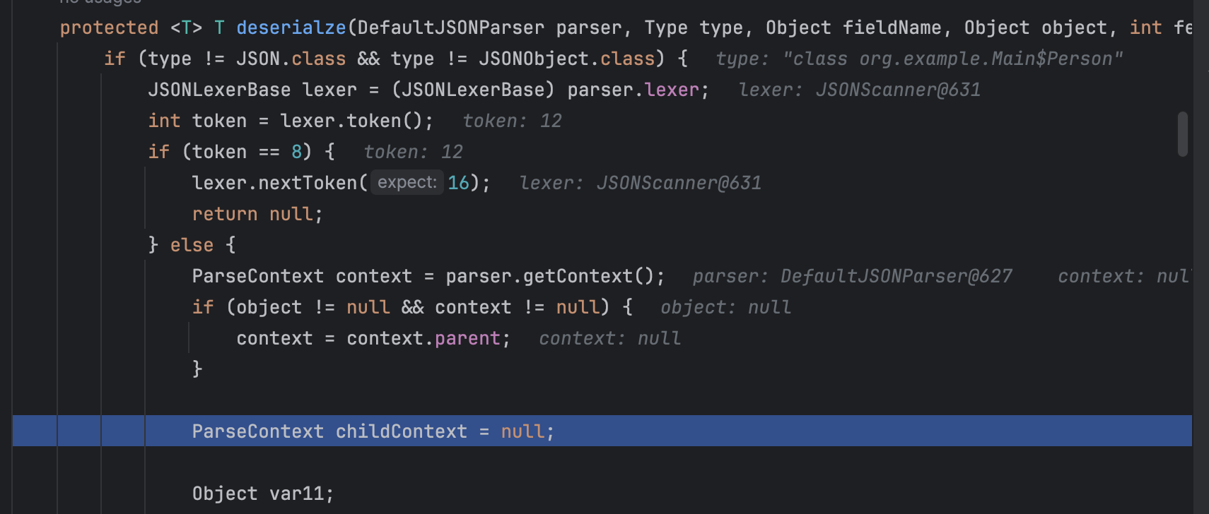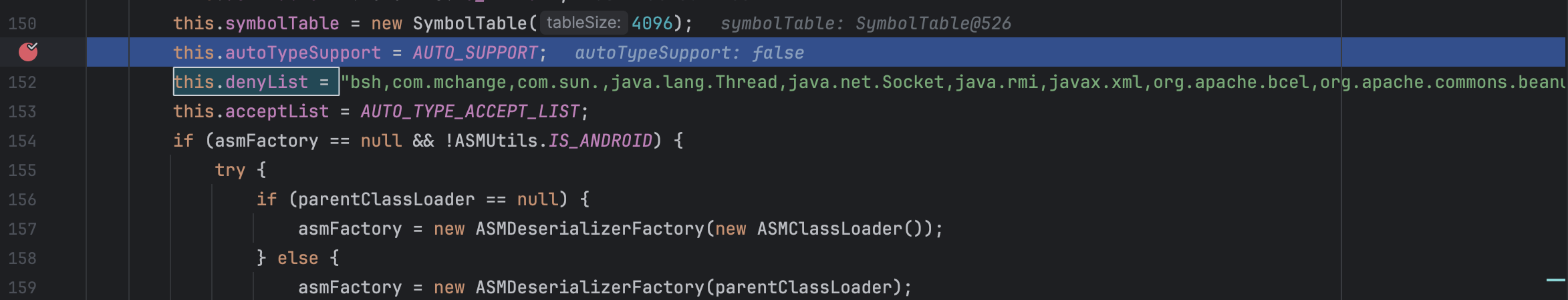 这里为了方便调试查看代码,加入了ParserConfig.getGlobalInstance().setAsmEnable(false); 打断点之后函数进入到