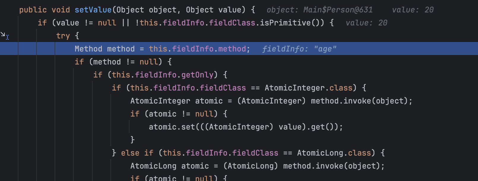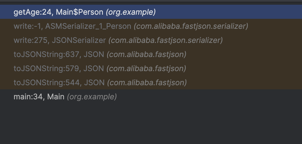 注意 parse方法反序列化只会调用setter,但是parseObject因为这里有return obj instanceof JSONObject ? (JSONObject)obj : (JSONObject)toJSON(obj);,它的返回值要求是 JSONObject。JSONObject 本质上是一个 Map<String, Object>,因此他在调用setter之后还会调用getter。 随后会开始反序列化 这里也可以看到调用了setValue方法 然后进入到setAge getAge方法也印证了我们刚开始的猜想,调用栈如下: 、