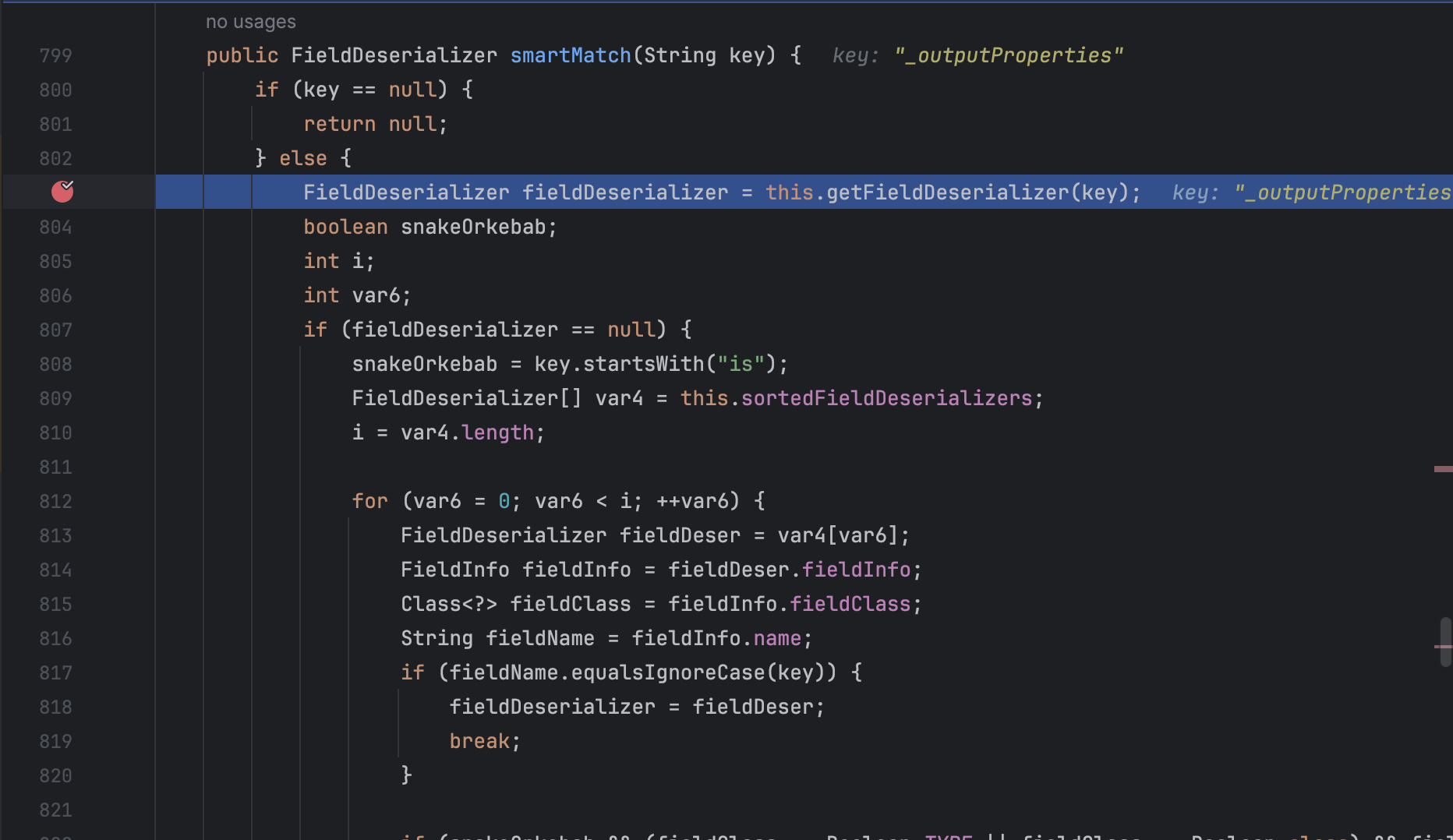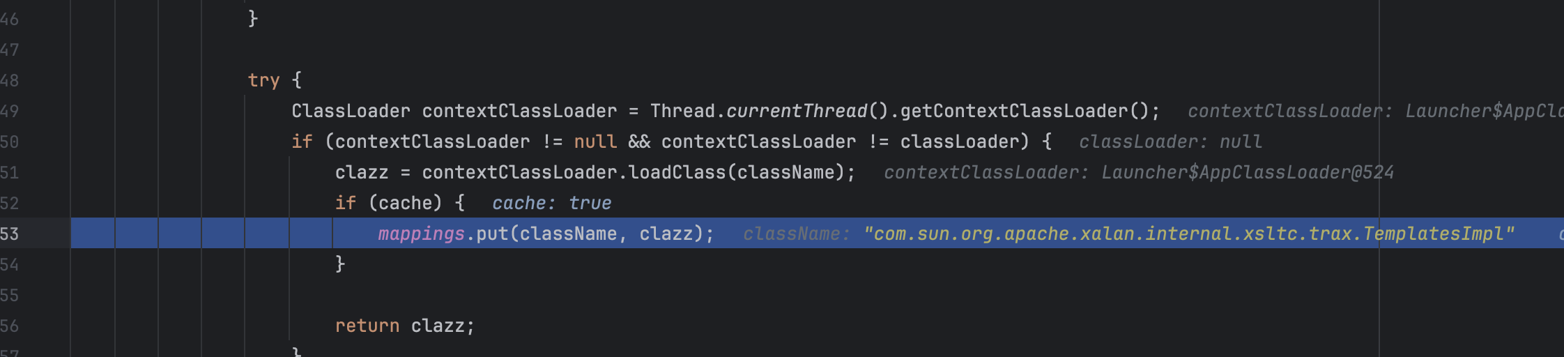 这里我们调试一下payload看看如何进入: 可以看到我们成功传入java.lang.Class这个类,之后会进入 然后mappings.put成功