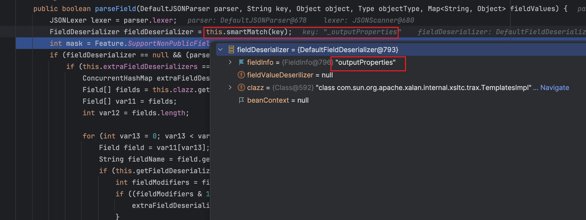 这要归功于 Fastjson 的SmartMatch,以及它对 Map 类型的特殊处理。Fastjson 有一个特性叫 SmartMatch。当它在 JSON 里看到 _outputProperties 时,如果找不到完全同名的字段,它会尝试把下划线 _ 去掉,把它当成 outputProperties 来处理 。寻找 Setter(优先)它拿着处理后的名字 outputProperties,去类里找 setOutputProperties()。但是TemplatesImpl 类里没有这个方法。如果是普通属性,到这一步就放弃了。但是,Fastjson 发现 outputProperties 对应的 Getter 方法,getOutputProperties()