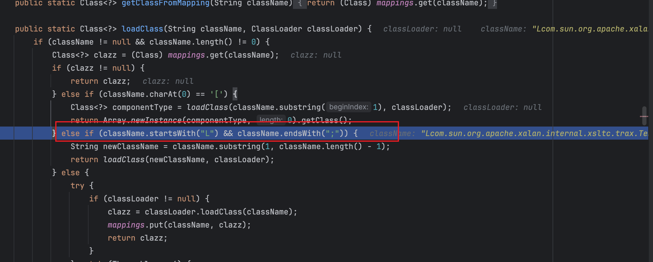 这里有一个检查逻辑是如果是L开头和;结尾就会去掉并加载 而这里是通过黑名单的之后做的,因此,可以通过这个手段进行绕过。
