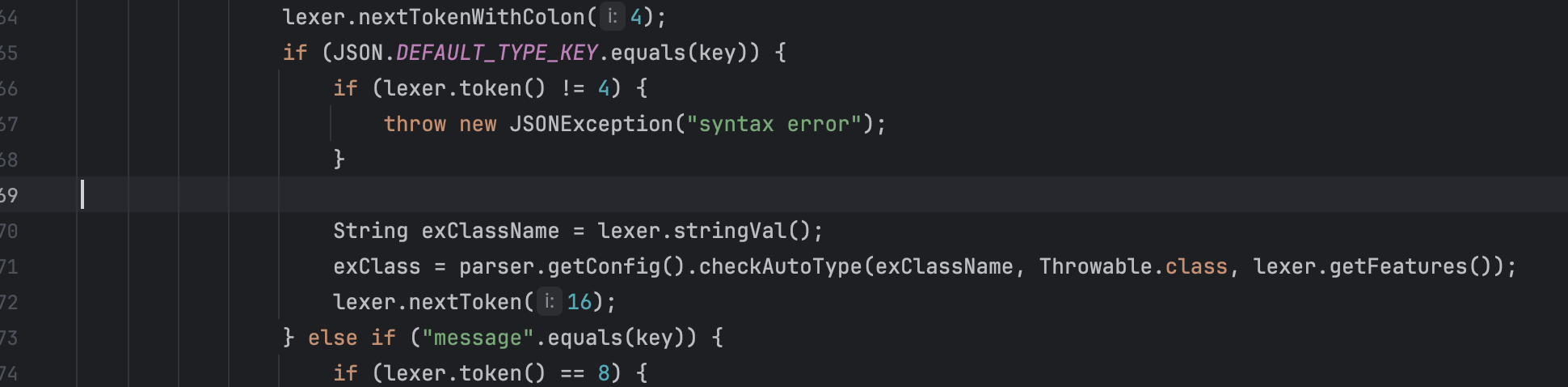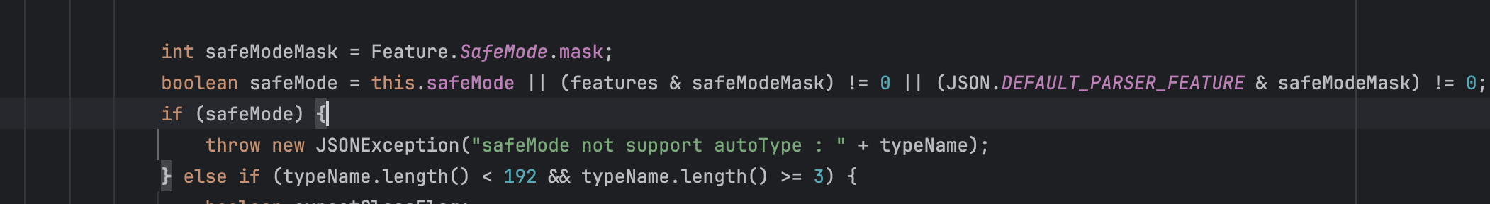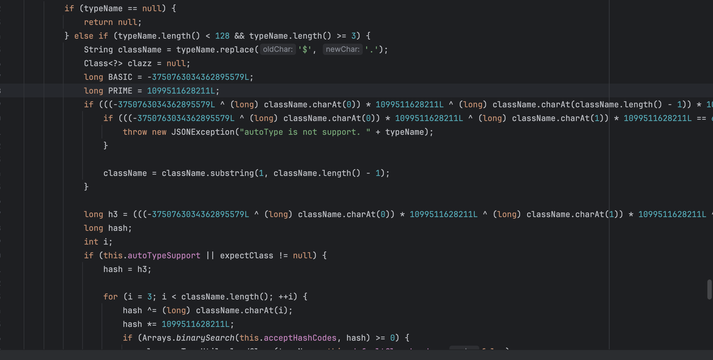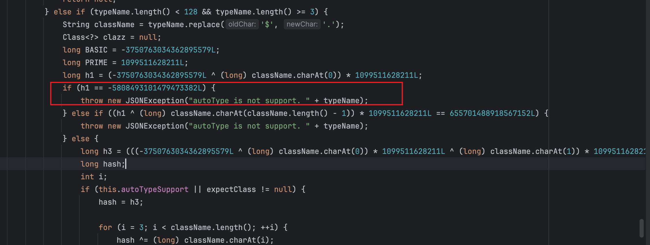 1 2 3 if (((-3750763034362895579L ^ (long )className.charAt(0 )) * 1099511628211L ^ (long )className.charAt(1 )) * 1099511628211L == 655656408941810501L ) { throw new JSONException ("autoType is not support. " + typeName); }