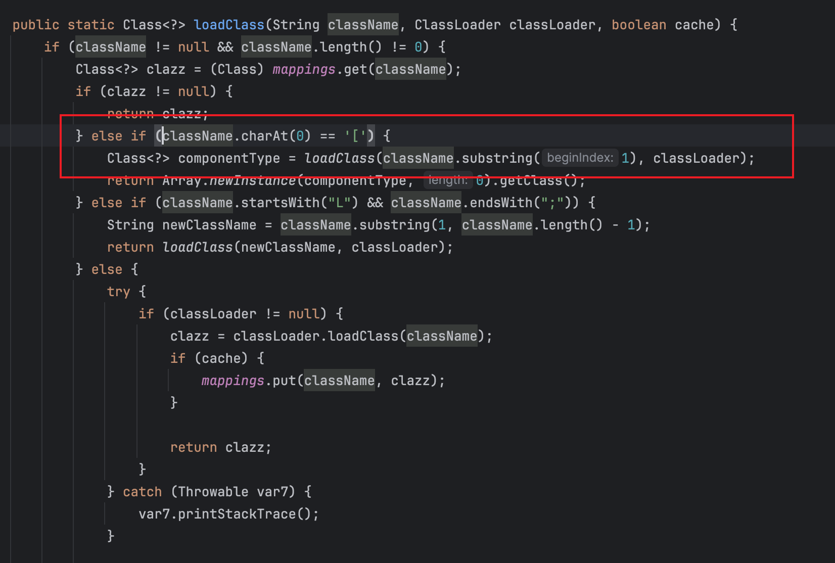 1 2 3 4 5 6 7 8 9 10 11 12 13 14 15 16 17 18 19 20 21 22 23 24 25 26 27 28 29 30 31 32 33 34 35 36 37 38 39 40 41 42 43 44 45 46 47 48 49 50 public static Class<?> loadClass(String className, ClassLoader classLoader, boolean cache) { if (className != null && className.length() != 0 ) { Class<?> clazz = (Class)mappings.get(className); if (clazz != null ) { return clazz; } else if (className.charAt(0 ) == '[' ) { Class<?> componentType = loadClass(className.substring(1 ), classLoader); return Array.newInstance(componentType, 0 ).getClass(); } else if (className.startsWith("L" ) && className.endsWith(";" )) { String newClassName = className.substring(1 , className.length() - 1 ); return loadClass(newClassName, classLoader); } else { try { if (classLoader != null ) { clazz = classLoader.loadClass(className); if (cache) { mappings.put(className, clazz); } return clazz; } } catch (Throwable var7) { var7.printStackTrace(); } try { ClassLoader contextClassLoader = Thread.currentThread().getContextClassLoader(); if (contextClassLoader != null && contextClassLoader != classLoader) { clazz = contextClassLoader.loadClass(className); if (cache) { mappings.put(className, clazz); } return clazz; } } catch (Throwable var6) { } try { clazz = Class.forName(className); mappings.put(className, clazz); return clazz; } catch (Throwable var5) { return clazz; } } } else { return null ; } }