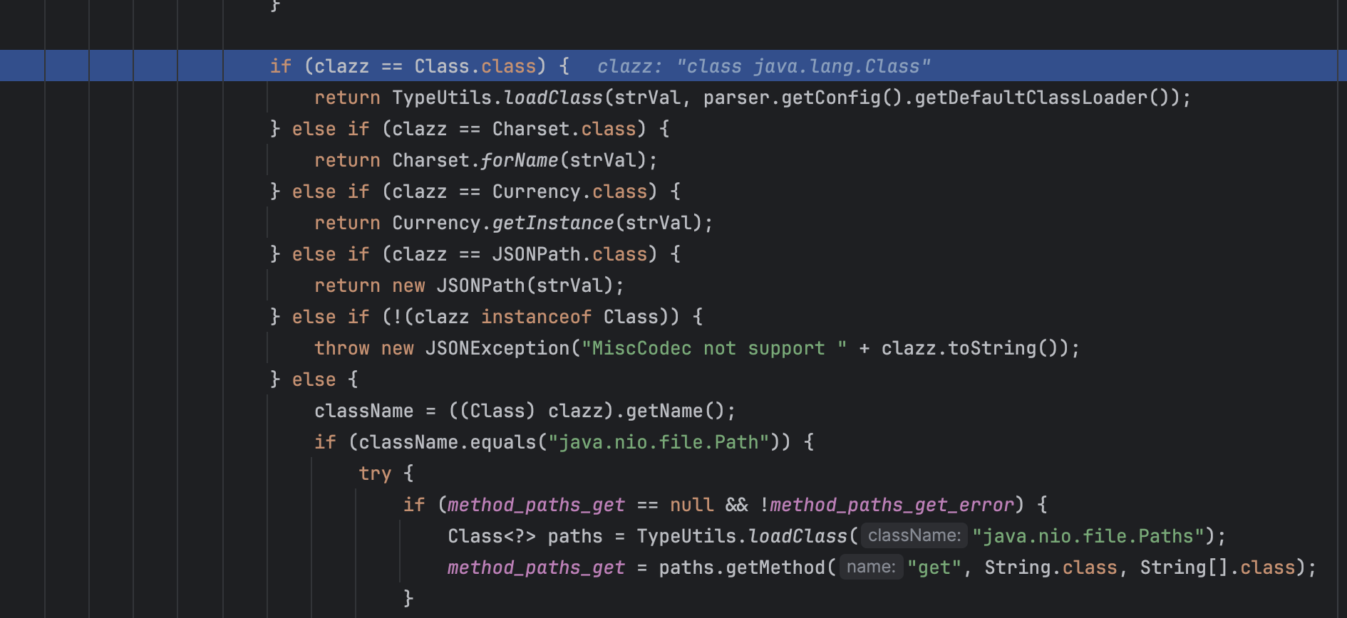 Class<?> loadClass(String className, ClassLoader classLoader, boolean cache):这是最底层的实现方法。虽然它有一个 boolean cache 参数,但在 Fastjson 的现有代码库中,调用这个方法的地方(例如 checkAutoType 内部检查白名单时),传递给 cache 的参数值通常被硬编码为 false。