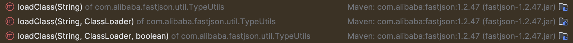 Class<?> loadClass(String className):该方法的内部实现通常是调用 loadClass(className, null, true)。虽然它默认开启了缓存,代码引用分析发现,能够触发这个方法的上层调用者,在反序列化过程中很难被简单的 JSON 数据触发,或者触发条件极其苛刻。