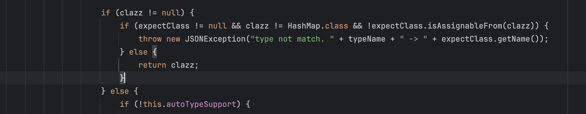 1 2 3 4 5 6 7 8 9 10 11 12 13 14 15 if (clazz == null ){ clazz = TypeUtils.getClassFromMapping(typeName); } if (clazz == null ) { clazz = this .deserializers.findClass(typeName); } if (clazz != null ) { if (expectClass != null && clazz != HashMap.class && !expectClass.isAssignableFrom(clazz)) { throw new JSONException ("type not match. " + typeName + " -> " + expectClass.getName()); } else { return clazz; } }