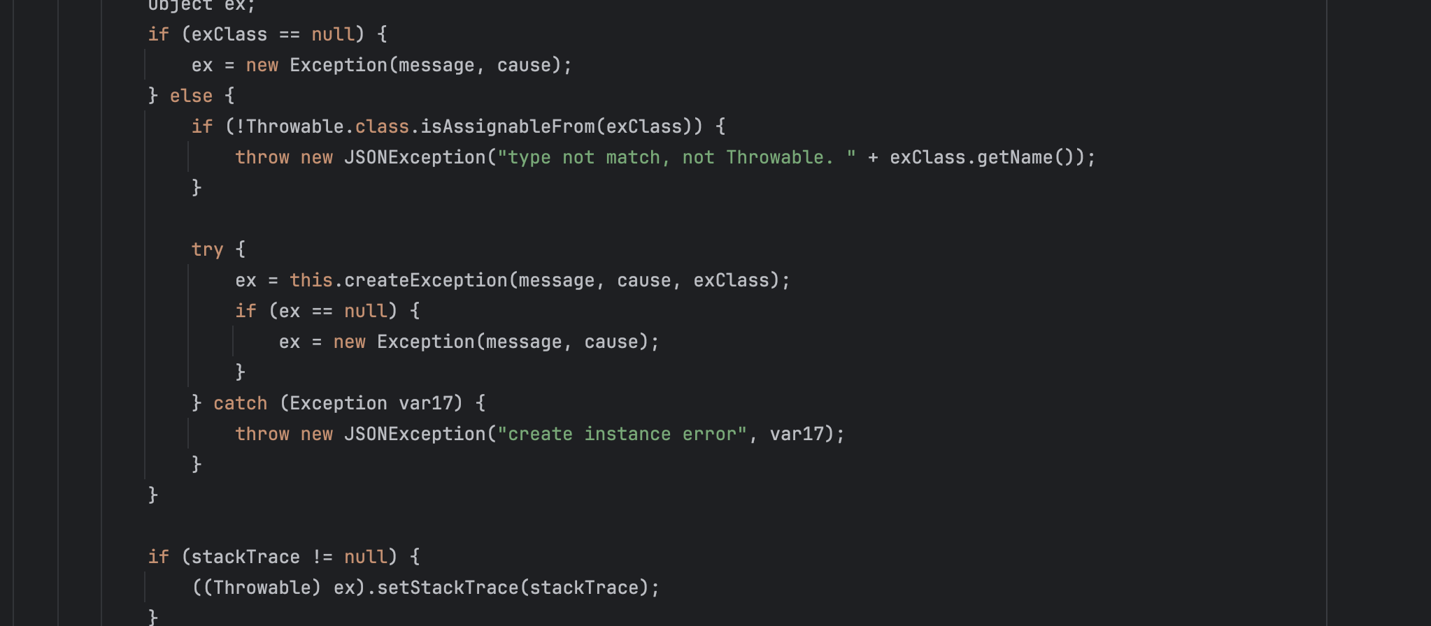 ThrowableDeserializer#deserialze() 方法直接将 @type 后的类传入 checkAutoType() ,并且 expectClass 为 Throwable.class。 通过 checkAutoType() 之后,将使用 createException 来创建异常类的实例. 这就形成了 Throwable 子类绕过 checkAutoType() 的方式。我们需要找到 Throwable 的子类,这个类的 getter/setter/static block/constructor 中含有具有威胁的代码逻辑。